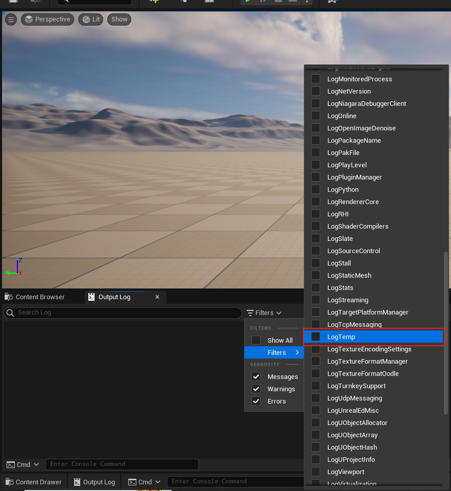 그 다음 우리가 LogTemp라는 카테고리로 설정한 Log이기 때문에 보기 편하게 필터를 적용해주자.
