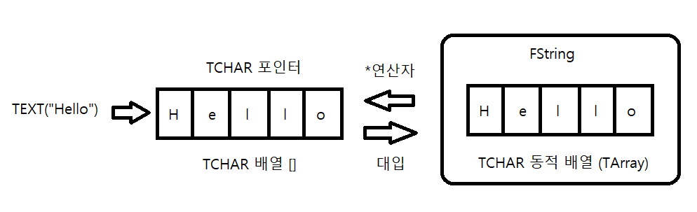 그니까 FString에 TCHAR의 배열을에 넣었을 때 TArray라고 하는 언리얼 엔진이 제공하는 동적 배열 클래스 방식으로 문자열을 보관한다.