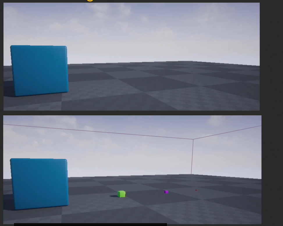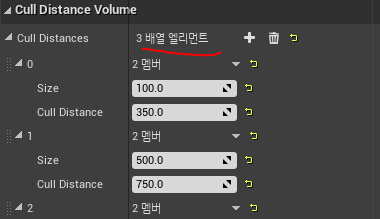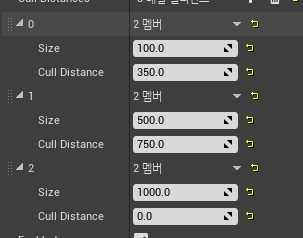 첫번째 배열 인덱스는 사이즈 0.0부터 100 언리얼 유닛까지 혹은 100센티미터의 크기까지 이 조건에 부합하는 레벨 내 오브젝트가 카메라로부터 350 유닛 이상의 거리만큼 떨어질 경우