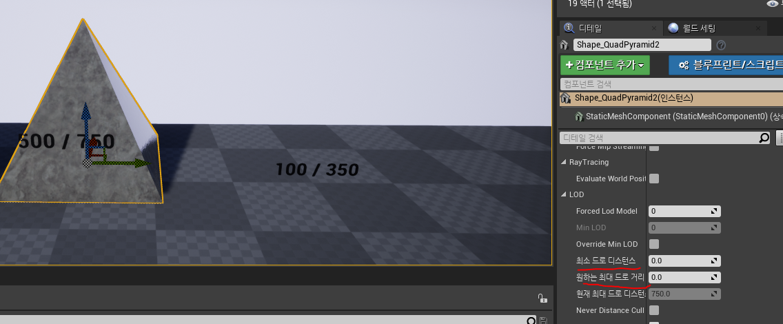 오브젝트를 선택해 최소 드로 디스턴스와 현재 최대 드로 디스턴스를 강제로 설정해주면 된다.