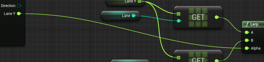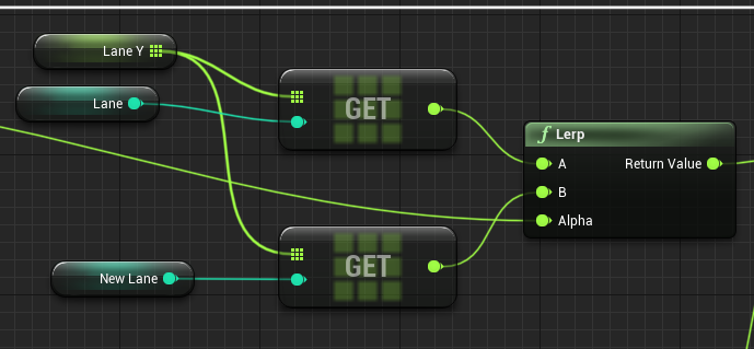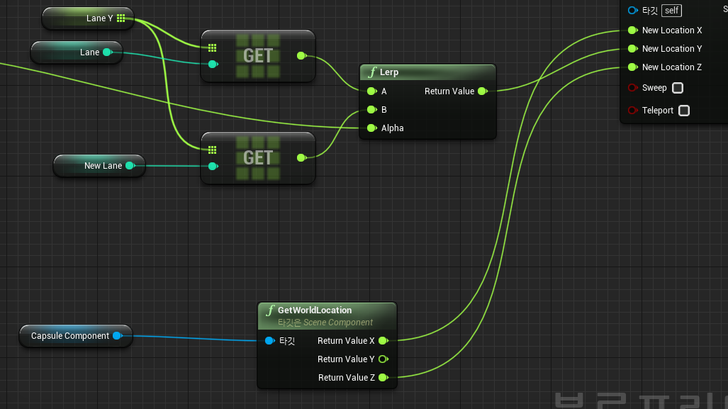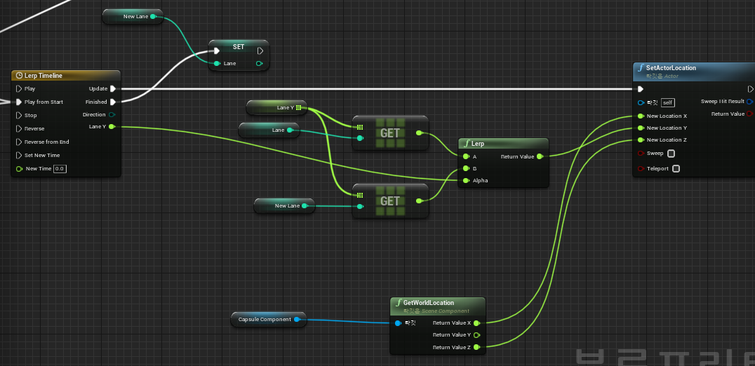 그러면 원래 y는 0이었던 캐릭터가 왼쪽을 누르게 되면 New Lane은 LaneY에 있는 0번째 배열에 들어있는 좌표 -330으로 설정이 되어 0.05초 동안 0이었던 Lane을 -330으로 선형 보간을 해주는 거다.