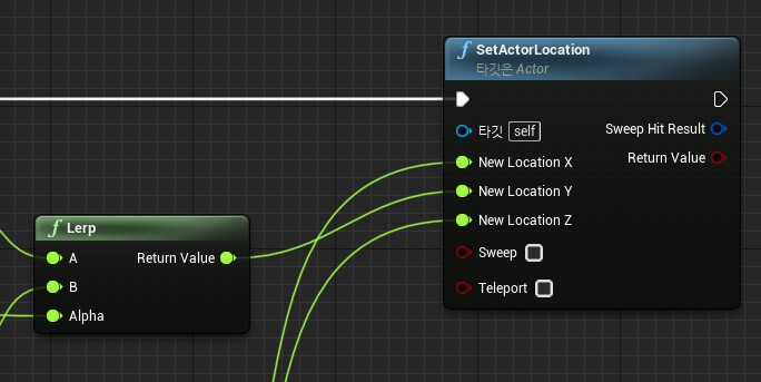 이 왼쪽 이벤트를 통해 타임라인 동안 SetActorLocation을 설정한다.