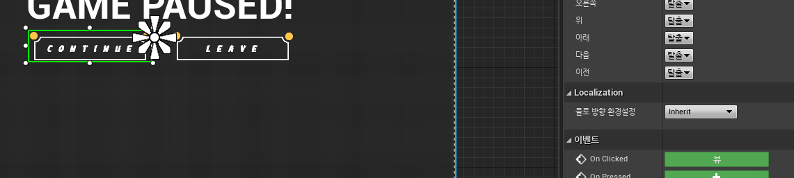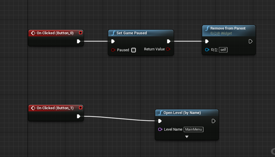 On Clicked(Button_0)이 Continue고 Button_1은 Leave버튼인데 우리는 이것을 메인 메뉴로 할 것이다.