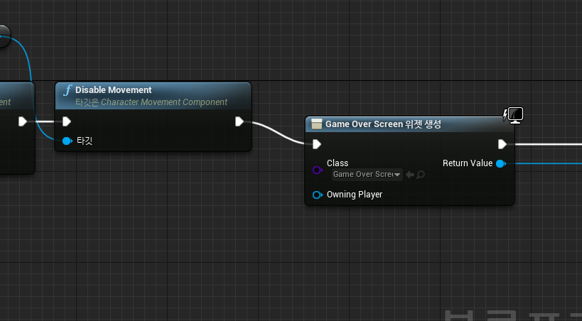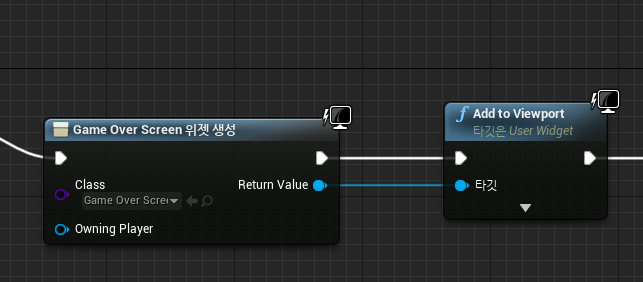 게임오버UI 위젯을 생성하고 그것을 Add to Viewport를 통해 화면에 나오게 한다.