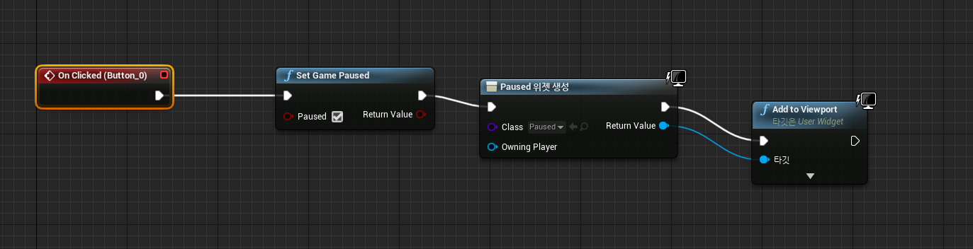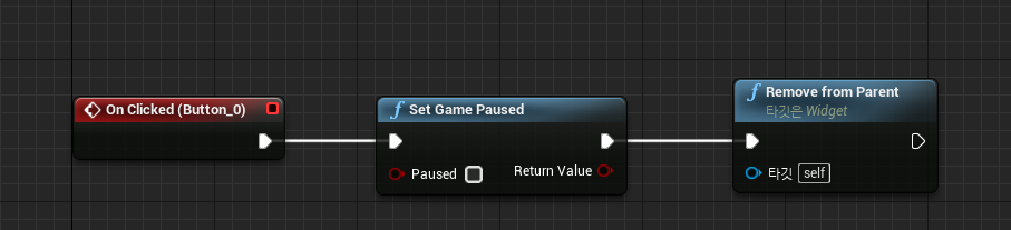 On Clicked 즉 클릭을 했을 때 Set Game Paused를 실행하도록 하자라는 말이다 그리고 Paused 위젯 생성을 해준다.