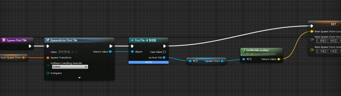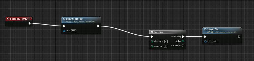 자 이벤트 그래프에 Spawn FirstTile을 불러주면 처음에는 이것만 불러주고 장애물이 안생기겠죠?