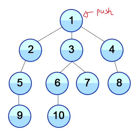 1의 자식들은 2, 3, 4가 있으니 2, 3, 4를 push 해줍니다.