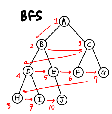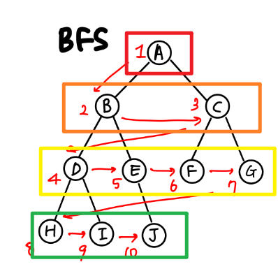 같은 레벨먼저 검사한 뒤에 그 다음 레벨의 노드들을 순차적으로 검사하는 방식이 이렇습니다.