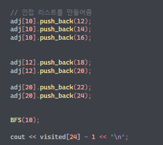 그래서 우리는 자식 노드를 탐색해서 방문하지 않은 자리에 + 1을 해주어 거리를 넣어줬습니다.