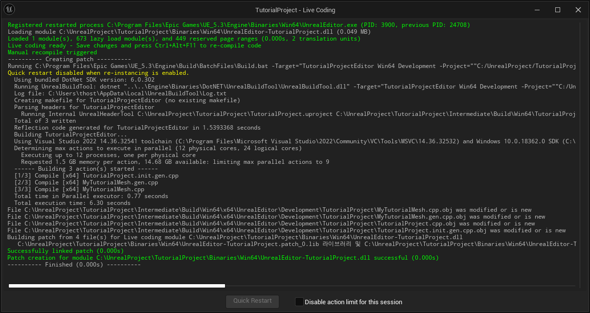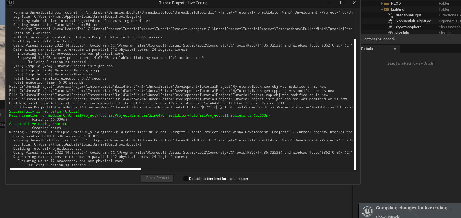 오른쪽 아래 보면 Compling changes for live coding...이라고 적혀있는데 코드가 바뀐거 다시 빌드해주는 모습인 것 같다.