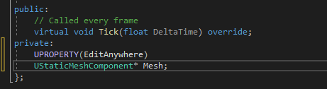 헤더파일에 스태틱 메쉬컴포넌트 변수를 만들어주고 UPROPERTY를 활용해 에디터에서 확인할 수 있는지 설정해주고