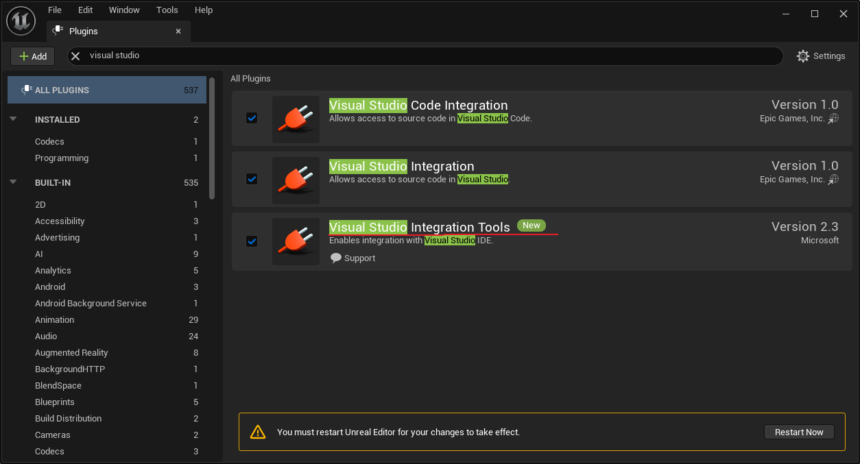 여기 플러그인에 들어가서 Visual Studio를 검색해서 아래로 내리면 우리가 다운받은 Visual Studio Integration Tool이 나온다. 그것을 체크해준 뒤 언리얼을 재시작하자.