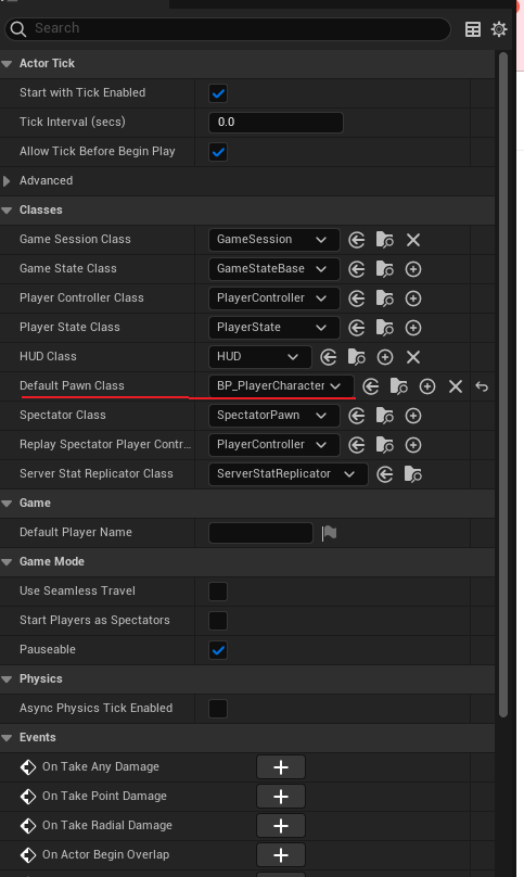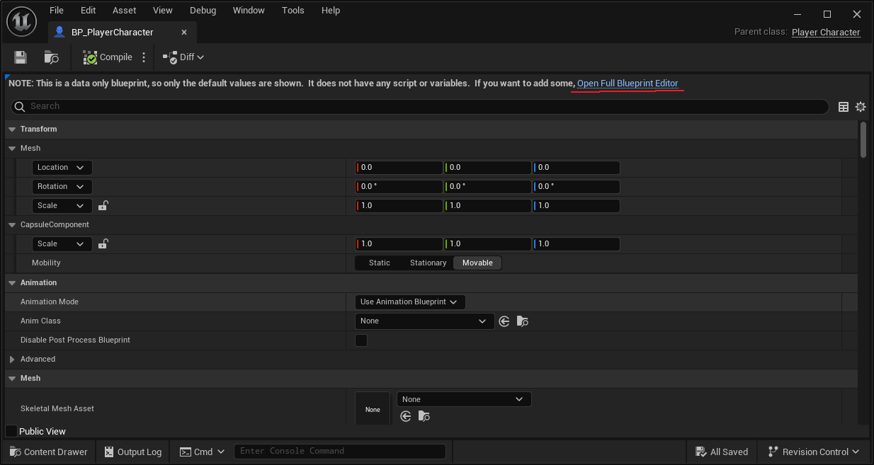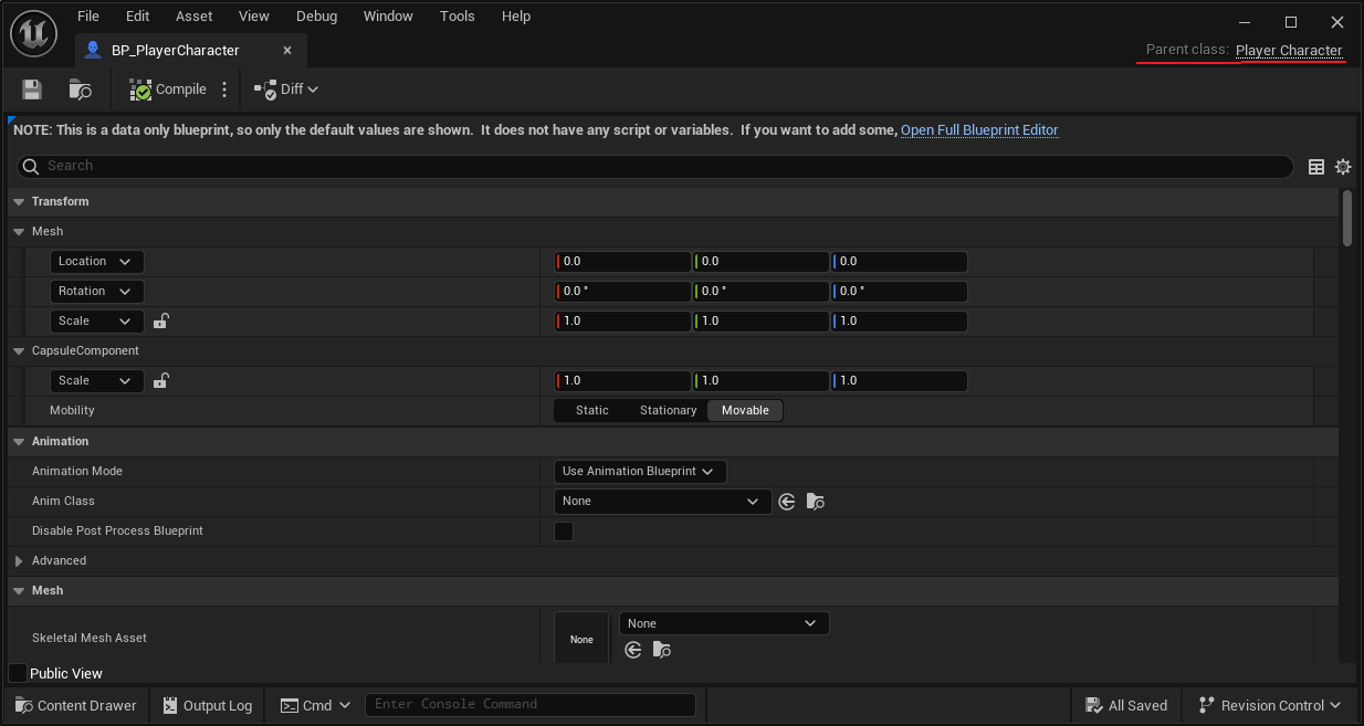 오른쪽 상단에 보면 제대로 연결이 된 것을 확인할 수 있다 부모 클래스가 PlayerCharacter로 되어있어야 한다.