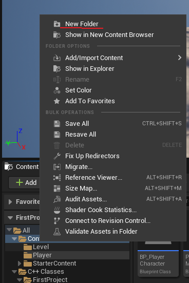 Player 폴더를 만들어서 BP_PlayerCharacter를 넣어줘서 보기 좋게 관리해 주자.