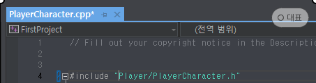 이렇게 cpp 파일을 열어보면 #include "Player/PlayerCharacter.h"라고 쓰여있는데, 이 헤더파일을 찾지 못해서 오류가 나는 것인데, 지정해 주면 된다.