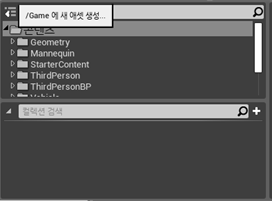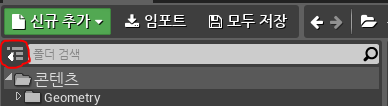 콘텐츠 브라우저 – 저장장치의 파일 구조와 애셋이 비슷파게 표시됨 여기서 아이템을 유지 관리하고 정렬, 필터링, 저장한 뒤 프로젝트에서 사용, 프로젝트 내부에서 사용하는 콘텐츠를 체계적으로 정리할수 있음(파일탐색기랑 비슷)