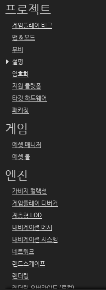엔진 카테고리에는 프로젝트에 대해 엔진이 어떻게 설정 되었는지, 입력이나 렌더링 설정 방식을 제어한다.