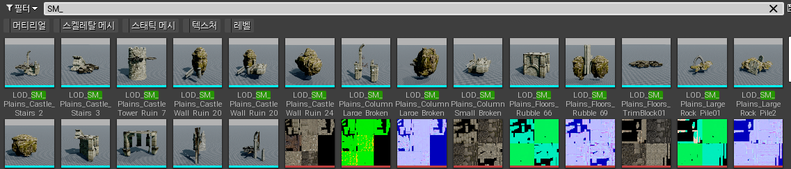 그래서 콘텐츠 브라우저에 검색을 할 때 SM_을 입력하면 다양한 스태틱메시의 애셋들이 나온다.